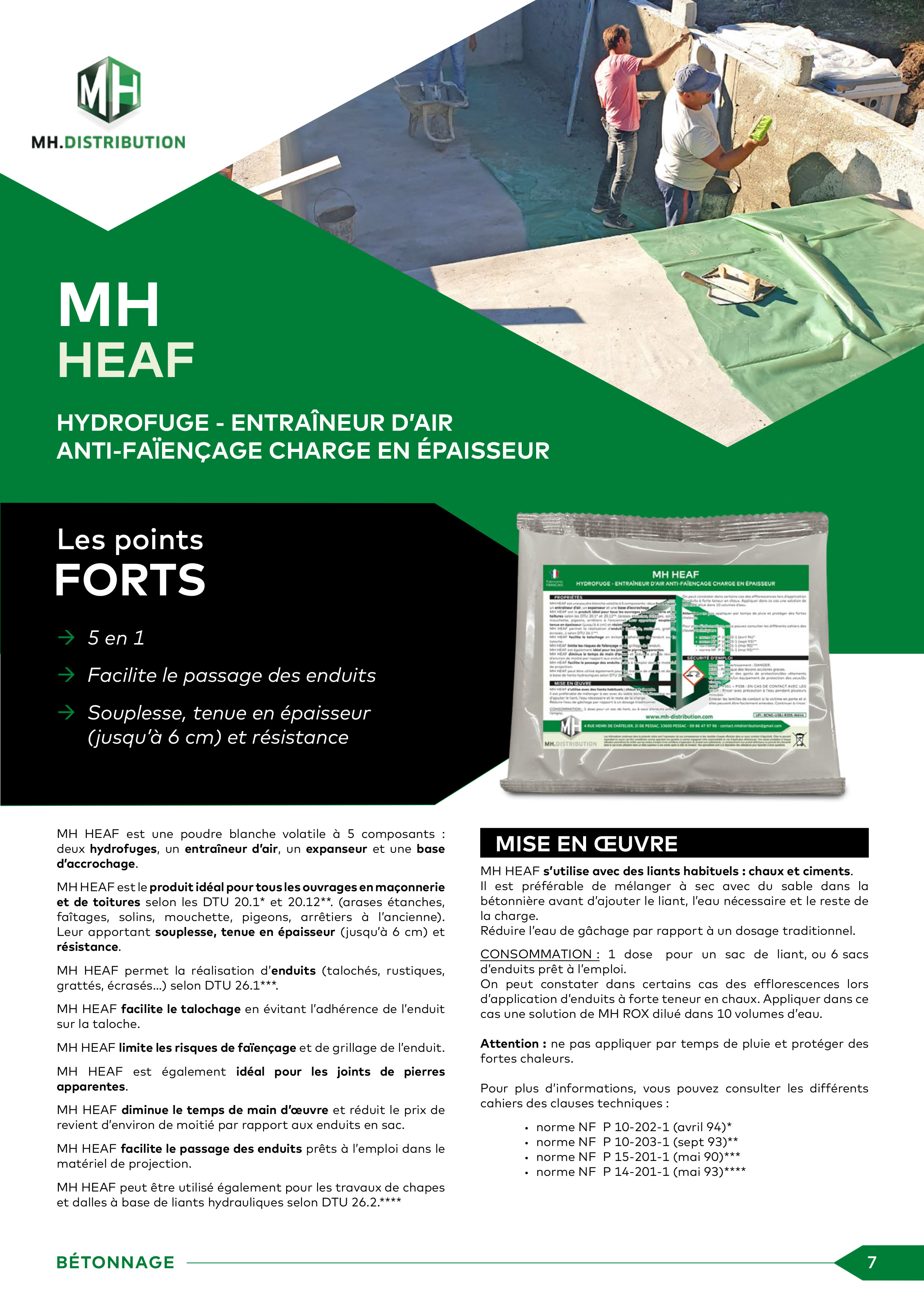MH HEAF est une poudre blanche volatile à 5 composants : deux hydrofuges, un entraîneur d’air, un expanseur et une base d’accrochage. MH HEAF est le produit idéal pour tous les ouvrages en maçonnerie et de toitures selon les DTU 20.1* et 20.12**. (arases étanches, faîtages, solins, mouchette, pigeons, arrêtiers à l’ancienne.) Leur apportant souplesse, tenue en épaisseur (jusqu’à 6 cm.) et résistance.