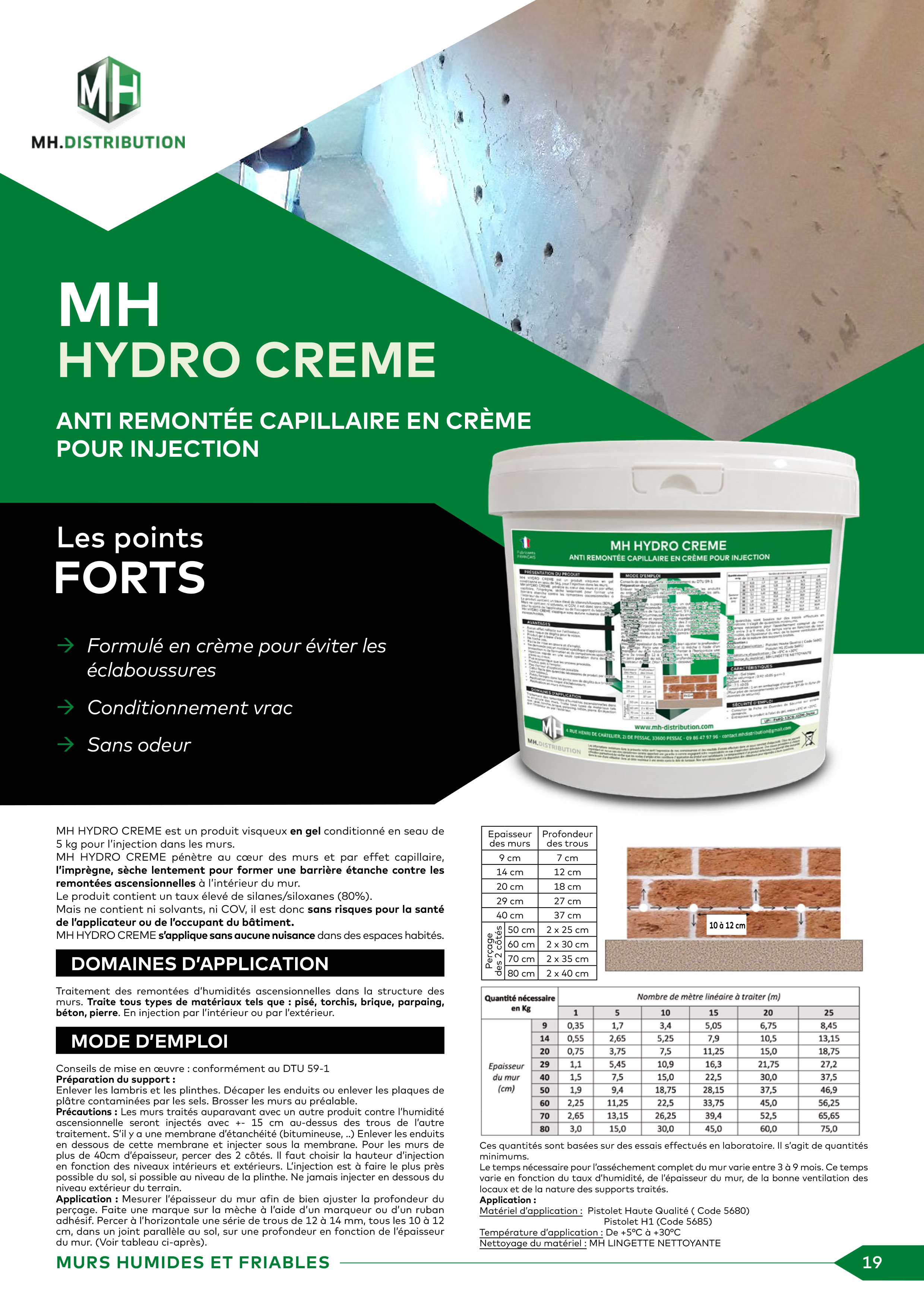 MH HYDRO CREME est un produit visqueux en gel conditionné en seau de 5kg, pour l’injection dans les murs. MH HYDRO CREME pénètre au cœur des murs et par effet capillaire, l’imprègne, sèche lentement pour former une barrière étanche contre les remontées ascensionnelles à l’intérieur du mur. Le produit contient un taux élevé de silanes/siloxanes (80%). Mais ne contient ni solvants, ni COV, il est donc sans risques pour la santé de l’applicateur ou de l’occupant du bâtiment. MH HYDRO CREME s’applique sans aucune nuisance dans des espaces habités